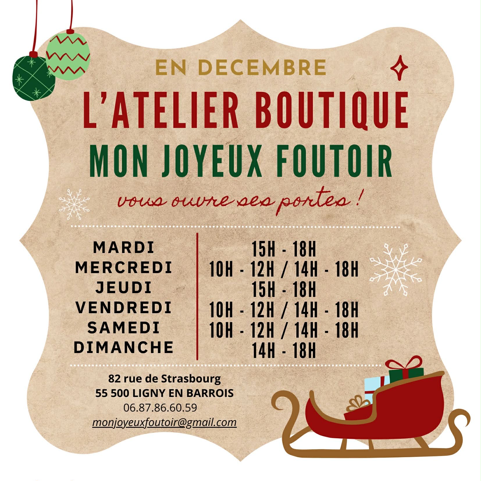 Vous trouverez ci-dessous les horaires d'ouverture de l'atelier-boutique pour ce mois de décembre 2025